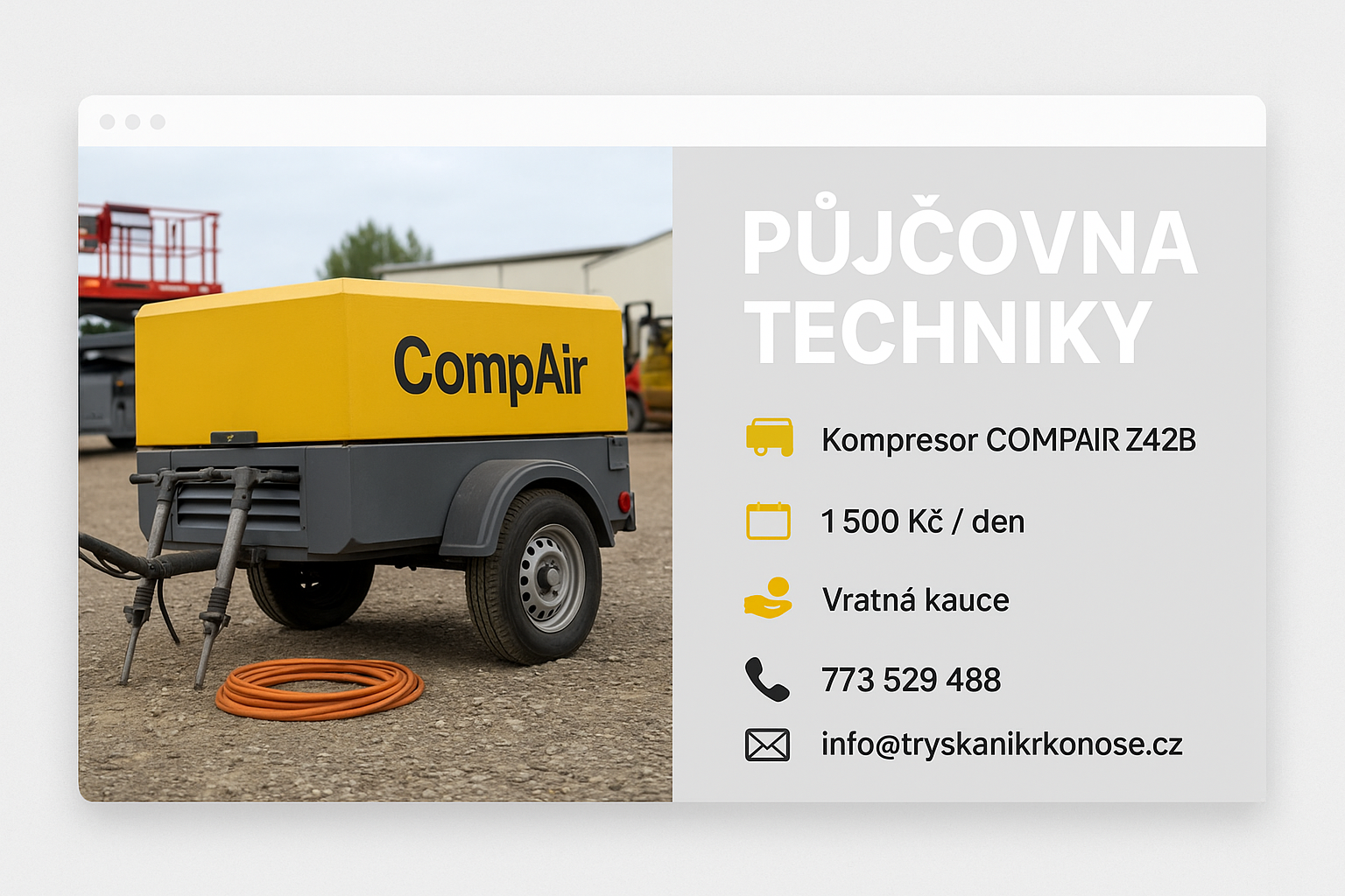 Nabízíme k zapůjčení dieselový šroubový kompresor COMPAIR Z42B, vhodný pro tryskání, pneumatické nářadí i další stavební činnosti.