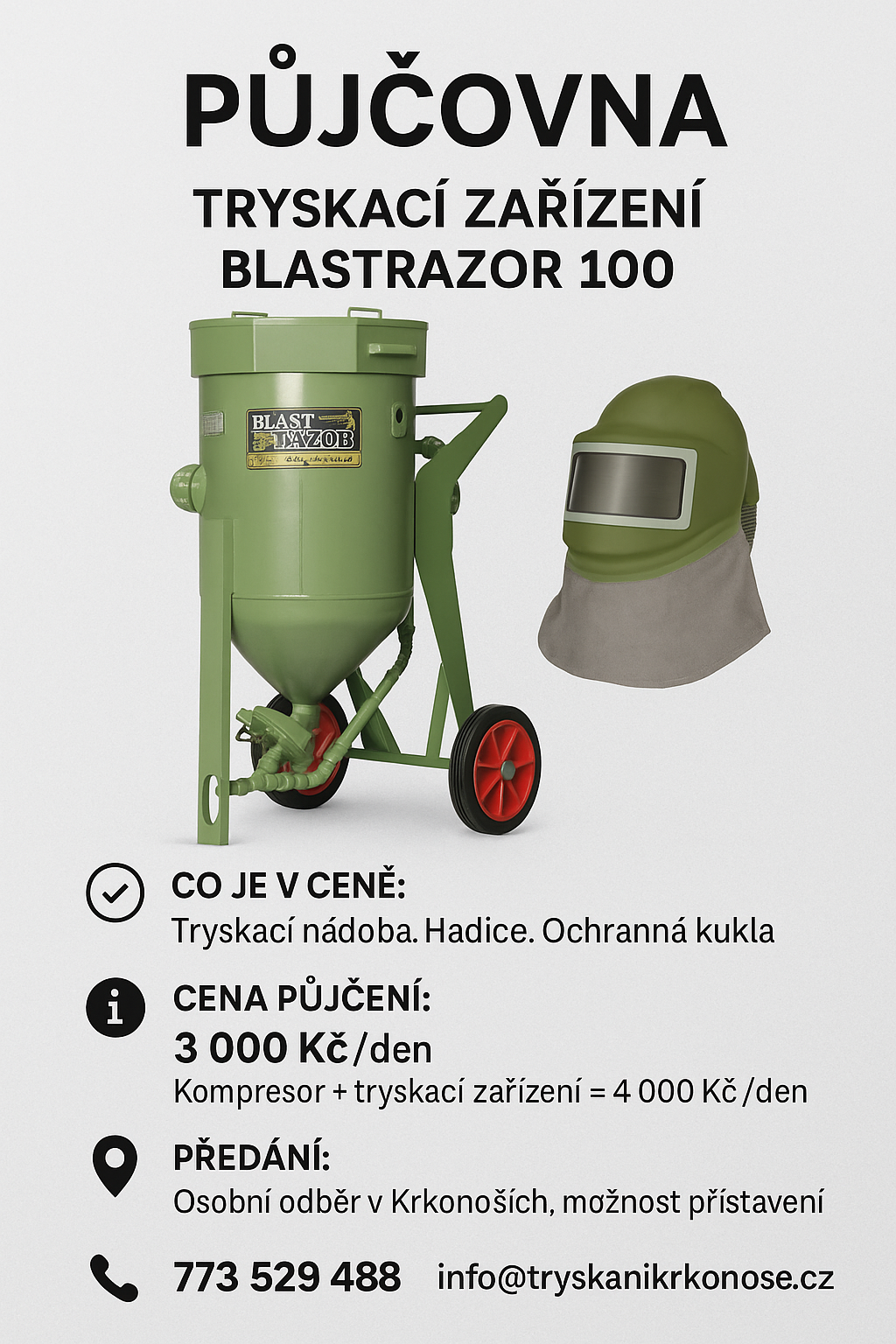 Nabízíme k zapůjčení profesionální tryskací zařízení BLASTRAZOR 100 pro tryskání dřeva, kovu, kamene, zdiva a dalších povrchů. Vhodné pro stavby, rekonstrukce i dílny.